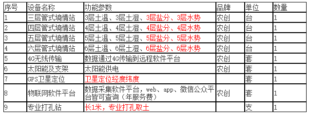 注:可定制測試深度、測試層數(shù)、土層間隔、標(biāo)配土壤參數(shù):溫度、濕度、可選參數(shù):鹽分、電導(dǎo)率、土壤水勢、土壤成分(供參考)氮、磷、鉀、銨態(tài)氮、硝態(tài)氮。