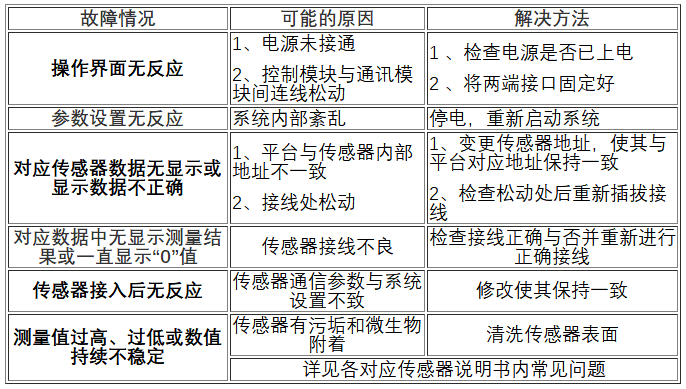 4.校準(zhǔn):如果進(jìn)行表面清洗和易損件更換后,傳感器所測(cè)數(shù)值仍不準(zhǔn)時(shí),需將傳感器從系統(tǒng)上取下,對(duì)其單獨(dú)進(jìn)行單點(diǎn)或兩點(diǎn)校準(zhǔn)。根據(jù)所對(duì)應(yīng)傳感器選擇合適的標(biāo)準(zhǔn)溶液。校準(zhǔn)方法及通訊協(xié)議詳見各對(duì)應(yīng)傳感器說明書。