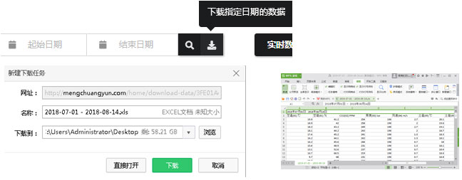 3、查詢功能:可通過查詢?nèi)掌诘姆绞娇焖俨檎?、下載所需的數(shù)據(jù),并以EXCEL表格的形式導出數(shù)據(jù)。具體操作:第一、輸入要查詢的日期時間段,點擊查詢按鈕即可;第二、點擊查詢右側(cè)三角按鈕,出現(xiàn)下載數(shù)據(jù)并點擊即可(圖2);第三、在圖2中選擇下載的位置并點擊下載按鈕即可(圖3)。詳見如下: