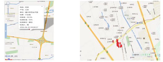 g、GIS地圖生成:利用檢測設備內(nèi)置的GPS模塊,實現(xiàn)衛(wèi)星定位數(shù)據(jù)捆綁測試數(shù)據(jù)信息,實施GIS地圖定點監(jiān)控每個檢測點的位置信息,監(jiān)測者可在其衛(wèi)星定位圖標上點擊位置坐標查看該檢測點測試數(shù)據(jù)相關(guān)索引信息。