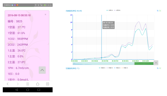 10、通過PC機(jī)和手機(jī)實(shí)時(shí)查看各個(gè)地點(diǎn)的空氣溫度、空氣濕度、二氧化碳、光照強(qiáng)度、土壤水分、地溫等農(nóng)業(yè)環(huán)境參數(shù)監(jiān)測(cè)數(shù)據(jù)。(可不使用)