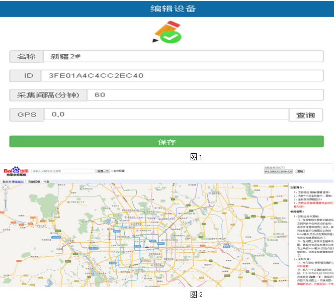 4、點(diǎn)擊設(shè)置按鈕,顯示編輯設(shè)備界面,可設(shè)置數(shù)據(jù)采集間隔和設(shè)置地理位置坐標(biāo),點(diǎn)擊保存按鈕即可成功。GPS定位具體操作:點(diǎn)擊查詢(xún)按鈕出現(xiàn)圖2,在圖2中百度要添加的地理位置,并拾取其坐標(biāo)復(fù)制粘貼到該處即可。詳見(jiàn)第9項(xiàng)GIS地圖生成。圖1和圖2如下: