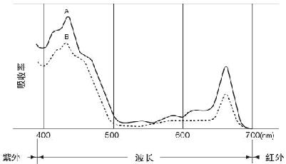 從圖中可以看出,葉綠素在藍色區(qū)域(400—500nm)和紅色區(qū)域(600—700nm)范圍內(nèi)吸收達到了峰值,但在近紅外區(qū)域卻沒有吸收。