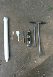 a. 取土鉆鉆頭、手柄、支桿,完成后將取土鉆豎直于地面,雙手緊握手柄順時針下壓慢速轉(zhuǎn)動。(注意:不要太用力,務(wù)必慢速多轉(zhuǎn)幾圈,防止鉆頭跑偏至孔洞打歪)
