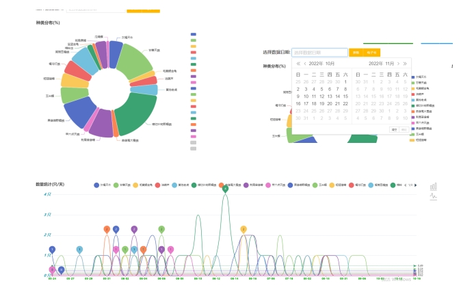 5、蟲害統(tǒng)計功能。針對不同品種害蟲識別結(jié)果歷史數(shù)據(jù),可選擇一定時間范圍內(nèi)數(shù)據(jù)查詢統(tǒng)計,通過圖表形式顯示??蛇x任意害蟲種類,直觀看出發(fā)生的蟲害種類和數(shù)量,從而判斷其危害程度。
