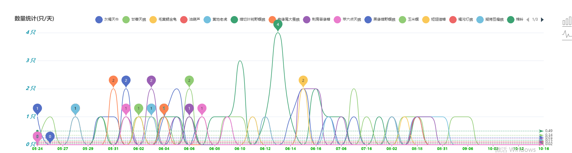 5、蟲害統(tǒng)計(jì)功能。針對不同品種害蟲識別結(jié)果歷史數(shù)據(jù),可選擇一定時間范圍內(nèi)數(shù)據(jù)查詢統(tǒng)計(jì),通過圖表形式顯示。可選任意害蟲種類,直觀看出發(fā)生的蟲害種類和數(shù)量,從而判斷其危害程度。